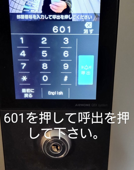 画面が変わりましたら、601を押して、画面右の呼出を押してください。応答して自動ドアを開けます。中に入ろエレベーターで6階までお越しください。