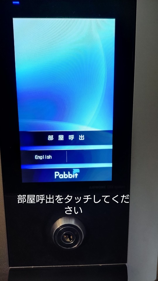 オートロックのドアの横にインターフォンがあります。部屋呼出をタッチしてください。